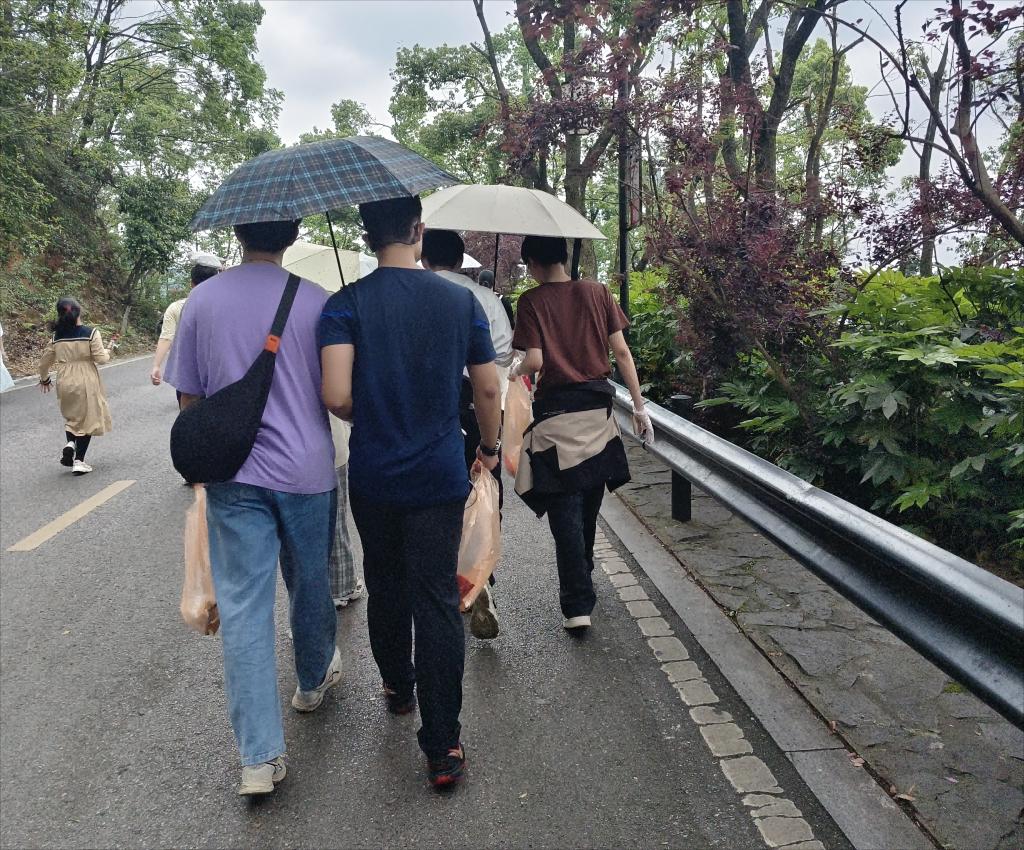 活动当天,学员们早早地来到岳麓山东大门集合,带着培训班准备的垃圾袋和手套,踏上了岳麓山的环保之旅。在班导师和组长们的带领下,学员们沿着山路一路向上,一边欣赏岳麓山的美景,一边仔细搜寻着沿途的烟头、塑料瓶、纸屑等垃圾。上山途中,天空突然飘雨,但丝毫不影响学员们的志愿服务热情,还有不少学员主动与身旁淋雨的游客共伞,传递着雨中的温暖和关爱。