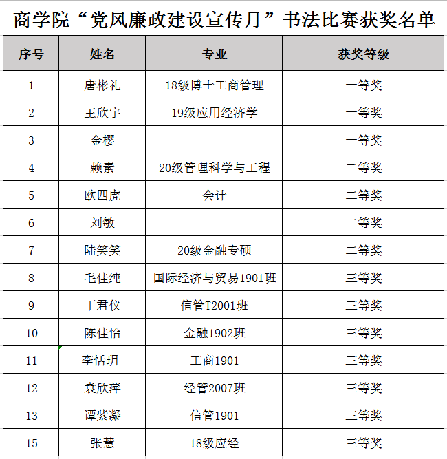 为深入贯彻落实德赢vwin体育官网登录党风廉政建设宣传月相关文件要求,进一步扩大党风廉政建设活动氛围,鼓励引导广大党员、同学廉洁自律、砥砺奋进,德赢vwin体育官网登录党委于2020年12月在全院开展“党风廉政建设宣传月”书法比赛,收集参赛作品50余份,经评审,具体获奖名单如下: