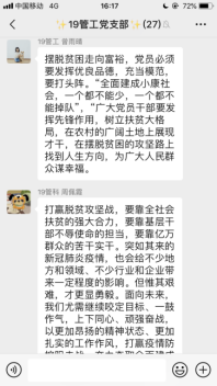 为深入学习贯彻习近平总书记在决战决胜脱贫攻坚座谈会上的重要讲话精神和十八大以来习近平总书记的青春寄语,激励党员勇于担当、积极奋斗,德赢vwin体育官网登录2019级管理科学与工程党支部于2020年5月13日至14日在线上开展了“学习习近平总书记在决战决胜脱贫攻坚座谈会上的重要讲话精神,重温习近平总书记青春寄语”主题党日活动。本次活动由党支部书记王怡文主持,共计26名党员参加。