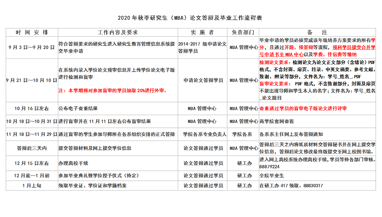 2020年秋季研究生(MBA)论文答辩及毕业工作流程表