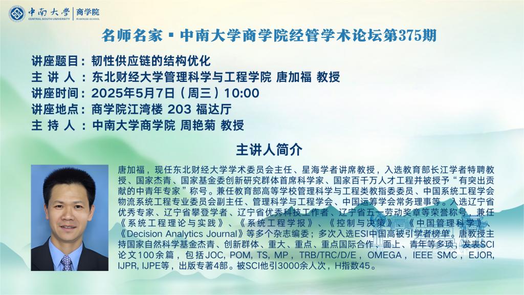 名师名家▪德赢vwin体育官网登录经管学术论坛第375期——东北财经大学管理科学与工程学院唐加福教授