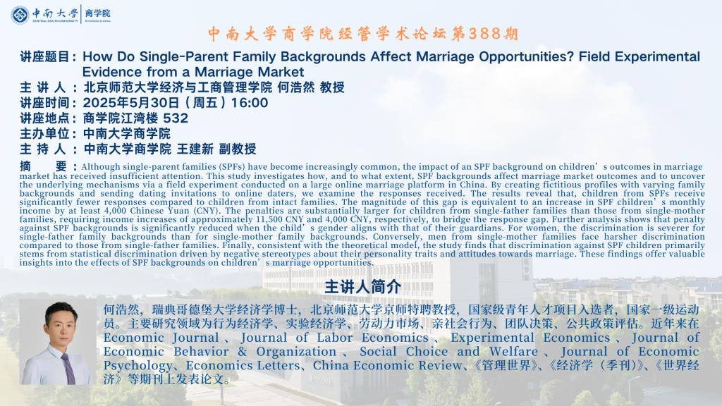 德赢vwin体育官网登录经管学术论坛第388期——北京师范大学经济与工商管理学院何浩然教授