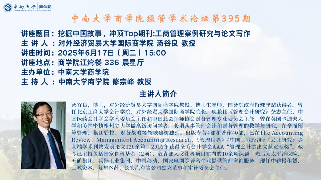 德赢vwin体育官网登录经管学术论坛第395期——对外经济贸易大学国际德赢vwin体育官网登录 汤谷良 教授