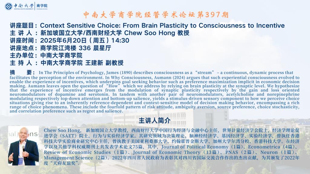 德赢vwin体育官网登录经管学术论坛第397期——新加坡国立大学/西南财经大学 Chew Soo Hong 教授