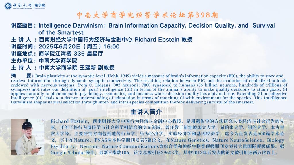 德赢vwin体育官网登录经管学术论坛第398期——西南财经大学智慧经济科学研究中心 Richard Ebstein 教授
