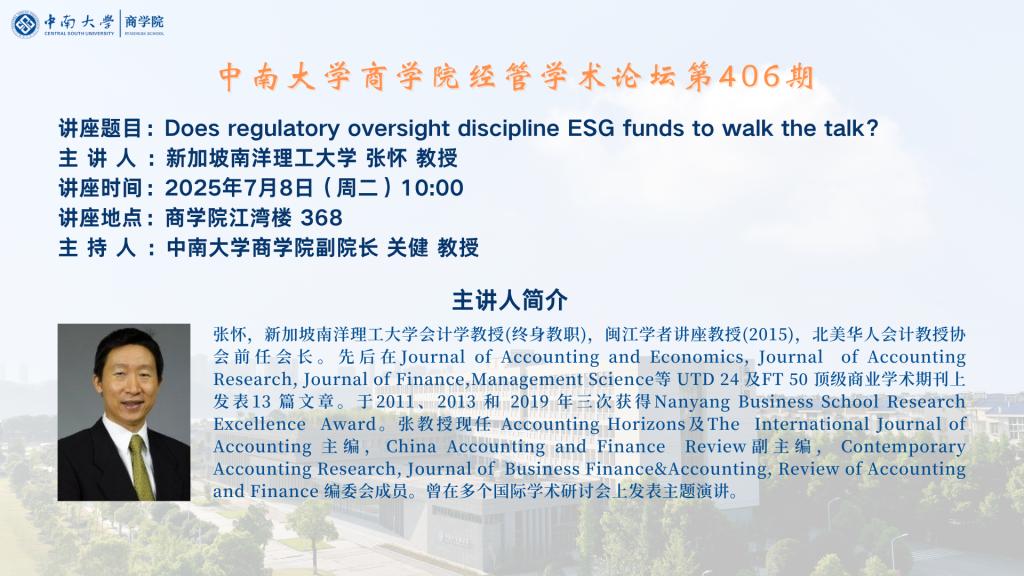 德赢vwin体育官网登录经管学术论坛第406期——新加坡南洋理工大学 张怀 教授
