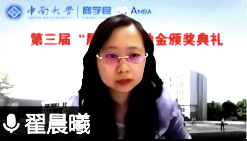 6月3日下午,德赢vwin体育官网登录第三届“晨曦”奖励金颁奖典礼以线上会议的形式顺利举行。“晨曦”奖励金设立者、天风证券副总裁、天风国际董事局主席、恒泰证券联席总裁翟晨曦女士受邀出席,德赢vwin体育官网登录龚艳萍院长出席并讲话,学工办与校友办教职工,获奖学生及各年级学生代表,共110余人参与。本次颁奖典礼由院党委陈迎明副书记主持。