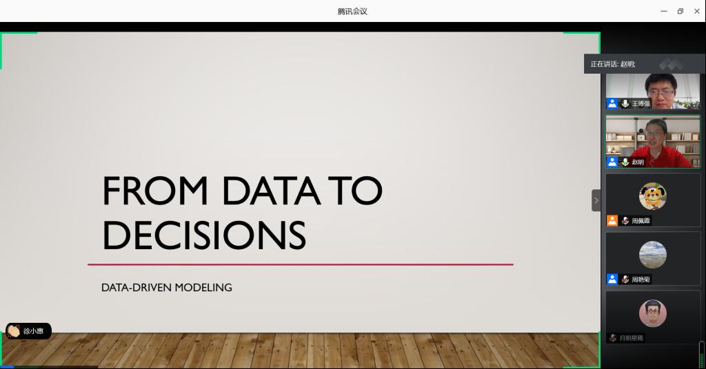 2020年7月8日早9点,由学院运营与供应链研究中心、服务科学与服务管理研究中心、管理科学与信息管理系、企业管理系联合主办的“数字赋能的企业智慧运营”系列讲座第四期通过腾讯会议线上开讲。第四期的主讲嘉宾是休斯顿大学助理教授赵明博士,题目是“From Data to Decisions: Data-Driven Modelling”。讲座由运营与供应链研究中心副主任王傅强副教授主持,周艳菊教授、马本江教授、施文教授、周雄伟教授、安庆贤副教授、李金霖副教授等老师,与信管卓越班本科生、MBA、管理科学与工程专业硕士生/博士生等共70多名师生参加了此次线上讲座。