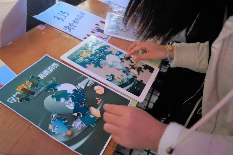 然后,同学们参加了权益趣味拼图游戏。有人两两结队,共同完成,也有人选择一个人战斗。大家都兴趣盎然,沉浸于拼图的世界中。拼图成功后,很多同学都进行了拍照留念,也有许多同学仍意犹未尽,选择再来一次。
