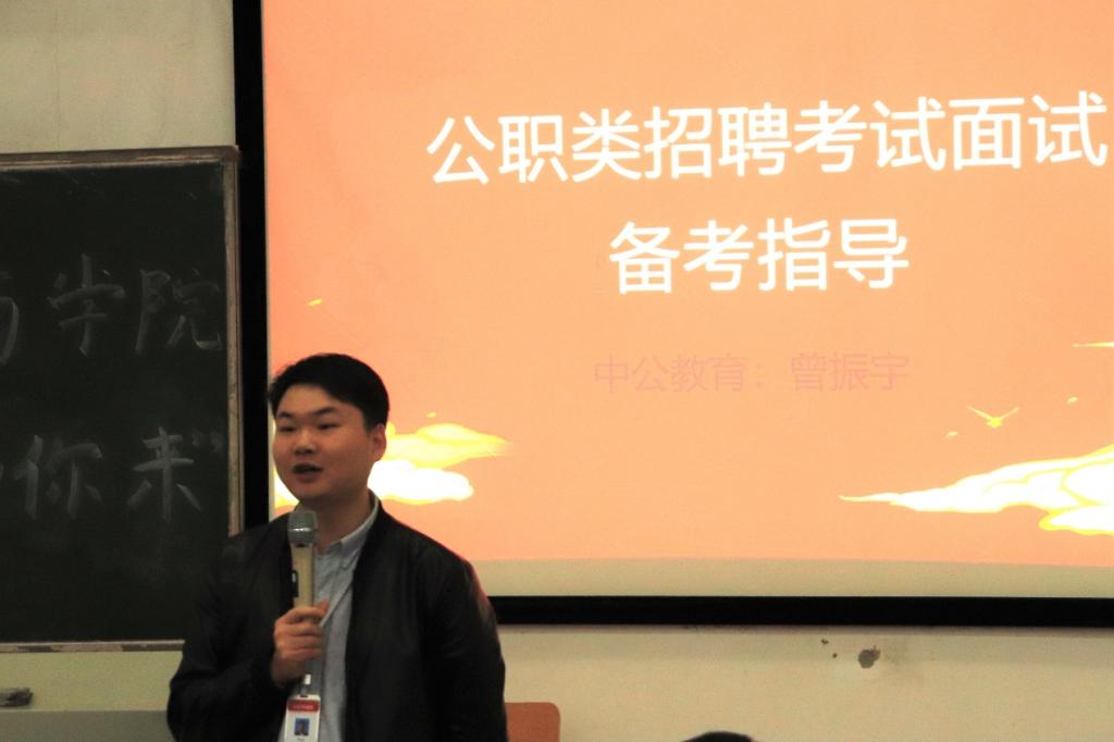 接下来正式进入培训环节。中公教育集团曾振宇老师对企业应聘、公务员考试和选调生报考三个方面进行讲解。就应聘面试而言不仅要注重专业知识的学习,还要了解面试相关知识和应变能力,要注意基本面试礼仪,衣着得体,举止大方,谈吐不凡,思维清晰等等,而公务员考试尤其是其中申论的备课要格外注意每日积累,阅读新闻,了解国内外大事。选调生则是一个有基层积累,有晋升空间的,为国家培养后备干部的职业。曾老师总结出公务员和选调生备考的系统的学习路径:要了解考试,系统学习,养成习惯,再实战练习。