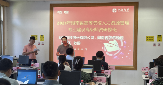 随后,新道科技股份有限公司湖南省区总经理侯腾飞致辞。在发言中侯总首先感谢德赢vwin体育官网登录在此次培训中提供的支持与帮助,对于此次参训的老师们表达由衷的欢迎。今年也是新道科技有限公司成立的第十年,作为平台型教育服务企业,新道教育希望汇聚政府、行业、企业、院校多方力量,共同服务院校数智人才培养,服务产业升级,推动中国教育事业和中国数字经济的进步与发展。