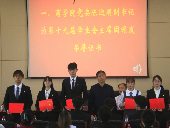德赢vwin体育官网登录党委副书记陈迎明为第十九届学生会主席团颁发荣誉证书。