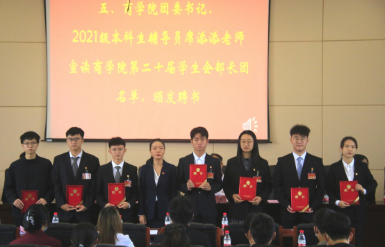 德赢vwin体育官网登录团委书记、2021级本科生辅导员席添添老师宣读德赢vwin体育官网登录新一届团委、学生会部门负责人名单,颁发聘书。
