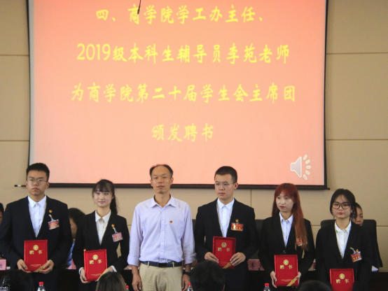 德赢vwin体育官网登录学工办主任、2019级本科生辅导员李苑老师为新一届德赢vwin体育官网登录本科生团委、学生会主席团成员颁发聘书。