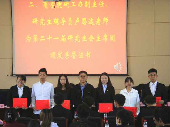 德赢vwin体育官网登录研工办副主任、研究生辅导员卢思远老师为第二十一届研究生会主席团颁发荣誉证书。