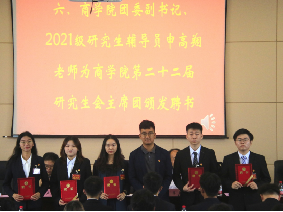 德赢vwin体育官网登录团委副书记、2021级研究生辅导员申高翔老师为新一届德赢vwin体育官网登录研究生团委、研究生会主席团成员颁发聘书。
