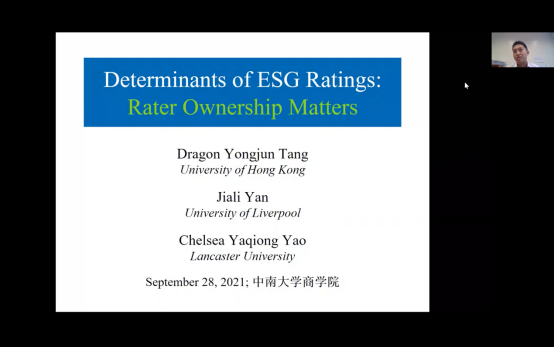 2021年9月28日上午10:00,由德赢vwin体育官网登录金融创新研究中心,德赢vwin体育官网登录绿色金融研究中心,德赢vwin体育官网登录金融系联合打造的德赢vwin体育官网登录名师名家学术论坛如期举行。本次论坛采用线上形式,邀请香港大学德赢vwin体育官网登录教授,金融创新发展中心教授汤勇军(Dragon Yongjun TANG)进行题为“The Determinants of ESG Ratings”的精彩讲座,本次讲座由德赢vwin体育官网登录副院长,德赢vwin体育官网登录绿色金融研究中心主任危平教授主持,出席本次讲座的还有德赢vwin体育官网登录博士生导师吴庆田教授,德赢vwin体育官网登录各年级硕博生参加了本次讲座。