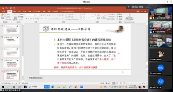 研讨会第二项为会计学专业院长(系主任)讨论交流,由会计与财务系修宗峰副教授主持。讨论交流会期间,龚光明教授结合王跃强教授讲的经验浅谈了个人课程思政教学的经验,期间,各位老师相互探讨教学思政经验,气氛十分活跃。