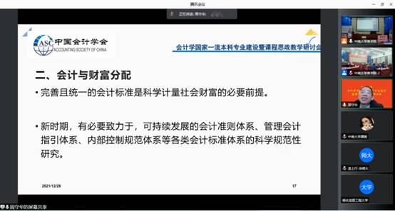 2021年12月26日上午8:30,由德赢vwin体育官网登录主办,德赢vwin体育官网登录会计与财务系、会计研究中心承办的“德赢vwin体育官网登录会计学国家一流本科专业建设”暨课程思政教学研讨会如期举行。本次学术研讨会采用线上+线下相结合的方式,线下举办地点在德赢vwin体育官网登录管理楼管阶一。
