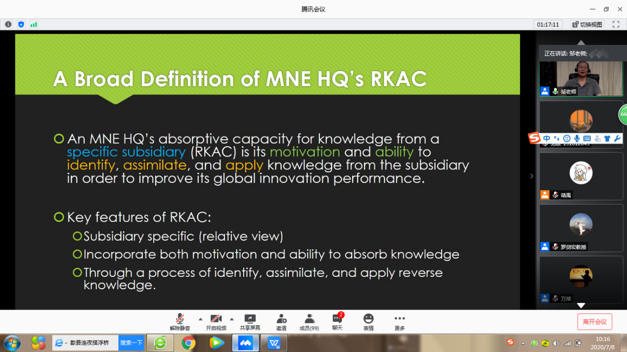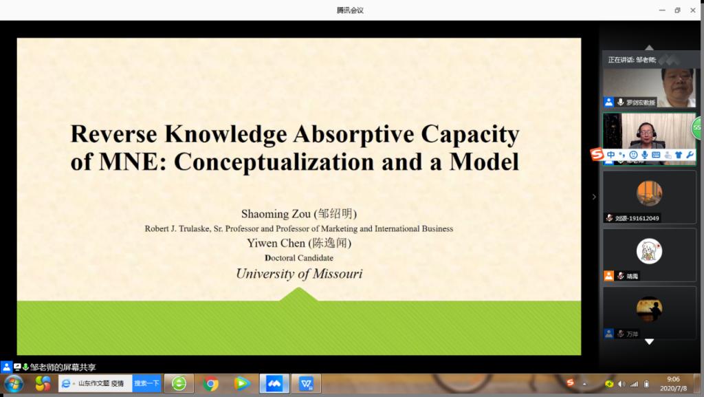 2020年7月8日上午,美国密歇根大学营销学博士,美国密苏里大学德赢vwin体育官网登录终身教授,Robert J.Trulsake,Sr.讲座教授邹绍明教授应邀通过线上讲座平台(腾讯会议)开展了主题为“Reverse Knowledge Absorptive Capacity of MNEs:Conceptualization and a Model”的学术讲座。会议由德赢vwin体育官网登录罗剑宏教授主持,德赢vwin体育官网登录相关教师、博士和研究生参加了本次讲座。