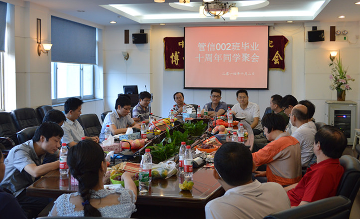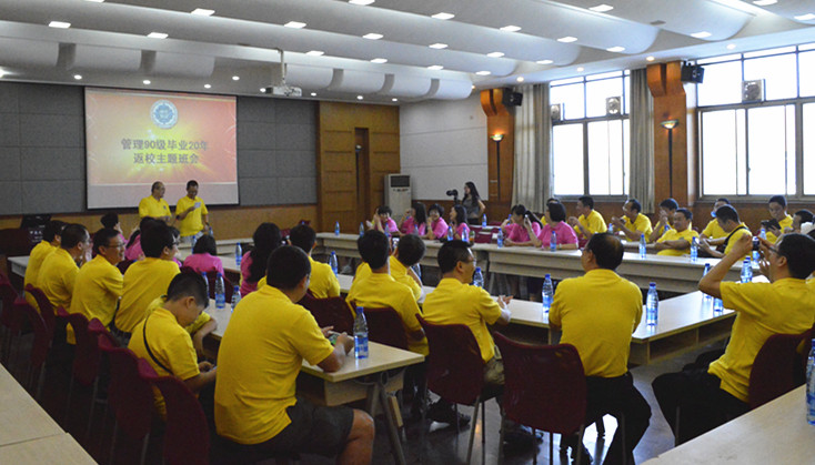 次日上午,管理系90级的全体返校校友在管理楼409举行了毕业十周年座谈会,聚会由两位返校校友代表主持。聚会开始首先是按寝室为单位的同学介绍,大家在久别重逢的同学面前分享自己二十年来经历的风风雨雨、欢笑辛酸。校友们在介绍了自己的经历的同时,也纷纷表达了自己对母校的深情,并通过毕业十年聚会视频和老照片回忆曾经的美好时光。会场里一片欢声笑语,其乐融融。
