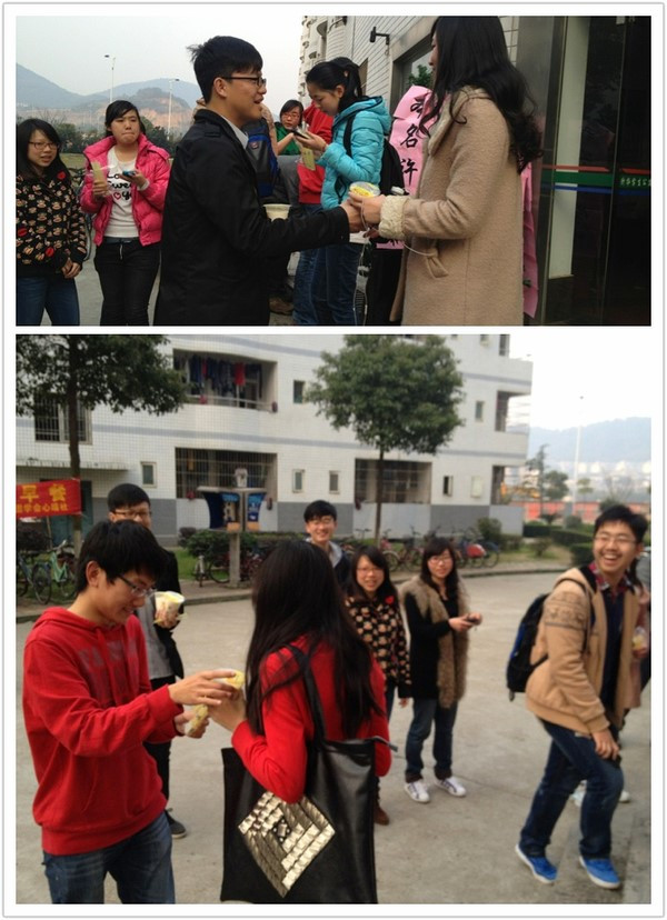 3月7日凌晨,南校区女生宿舍升华15栋,德赢vwin体育官网登录心晴社的成员们正在静悄悄地为每个宿舍的门上挂上精心准备的小礼物——载满班级男生亲笔书写的祝福贺卡和装满礼物的福袋。当清晨第一缕阳光照进15栋,宿舍楼门前已经排了长长的一队送爱心豆浆和等候送女生上学的男生志愿者。豆浆里融入暖意,德赢vwin体育官网登录的女生们不再寒冷;单车上搭载着友谊,前往教室的路上将不再孤单。据统计,此次共送出200份的爱心豆浆,共搭载了近100名的女生到达新校区。女生节就在这温馨的惊喜中开始了。