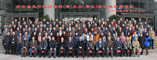 11月27日-12月1日,湖南省经信委联合德赢vwin体育官网登录在铁道校区国际报告厅举办了全省县市区经信委(局)主任(局长)培训班,培训班为期五天,全省共计160多名县市区经信委(局)主任(局长)参加了学习。第一天开班时湖南省经信委主任谢超英、副主任黄东红、德赢vwin体育官网登录常务副院长游达明教授以及省经信委多位领导与全体培训学员合影留念。