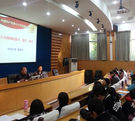 唐建华教授围绕十八大的“基点”、“要点”、“亮点”三个方面对十八大精神进行了深入的解读。我们必须高举中国特色社会主义伟大旗帜,坚定不移地走中国特色社会主义道路,坚持中国特色社会主义理论体系,为全面建成小康社会努力奋斗。党的十八大为党和国家事业的进一步发展指明了方向,是我们党团结带领全国各族人民夺取中国特色社会主义新胜利的政治宣言和行动纲领。
