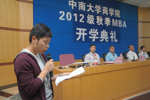 之后,2012级MBA学员马乐代表全体学员进行发言,他说,非常感谢德赢vwin体育官网登录给他们这次难得的学习机会,想起以前挑灯夜读备考的坚持和录取前的期盼,现在回到阔别已久的校园,心情非常的激动,对未来充满了期待。他说:“我们来自五湖四海,为了同一个目标走到一起,我们将会更珍惜未来将要共同走过的学习时光,尊敬师长,互助互爱,热爱这片培育我们的地方”。最后,他以“天道酬勤,付出终有回报”与大家共勉,希望与大家在德赢vwin体育官网登录这个大家庭里共同进步取得成功,完成心中的理想。