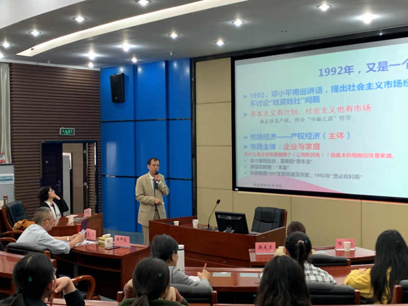 随后,伍中信教授介绍了自己产权会计与财务研究之路,及相关论文、课题与著作,重点讲解了产权与会计的关系。他认为,科学研究一定要与当代经济学、管理学同步,才能在本学科领域处于领先地位。伍中信教授以自身为例:亲自深入到湖南贫困县调查,了解农村的实际情况,为农民财产性收入改革奋斗了十年,形成了两个研究成果:国家社科基金一般项目——居民财产性收入增加与保障的财务体系创新研究;国家社科基金重点项目——新时期农村居民财产性收入扶贫模式的财务运作创新研究。以此勉励高校教师做学问应该立足国家、社会和人民的需求,与祖国和人民的需求同步,思考大问题,成就大学问。