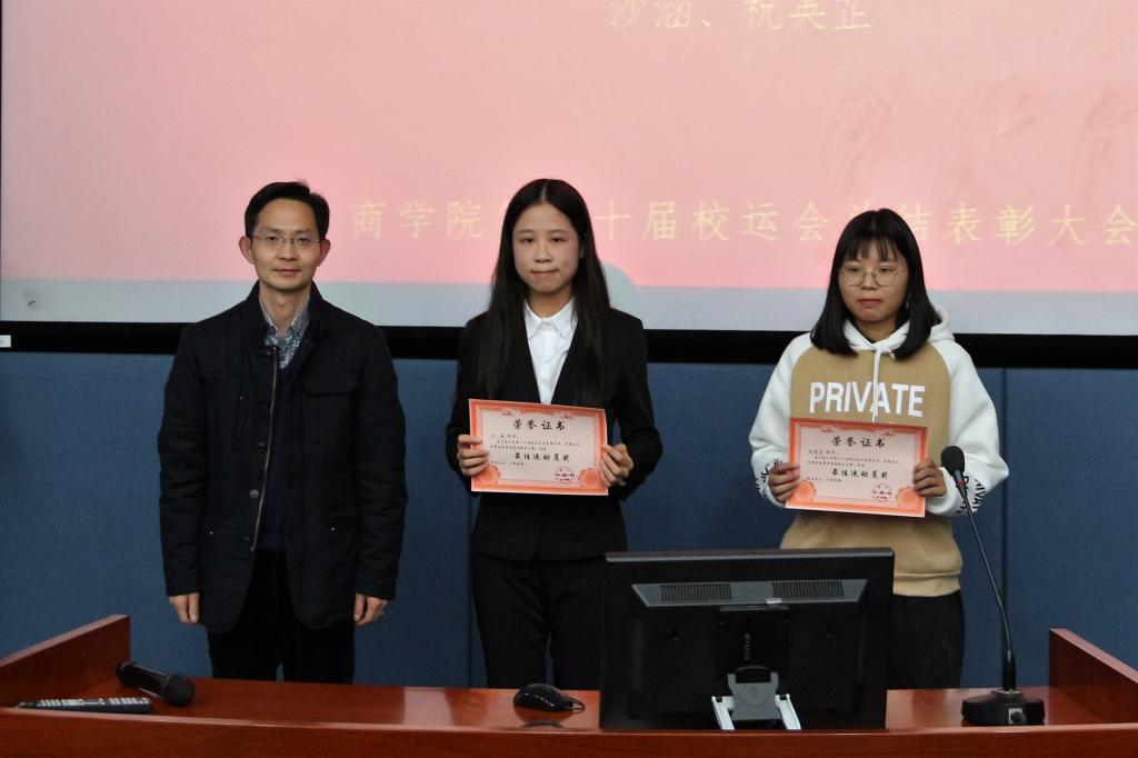 2019年12月4日下午14点30分,德赢vwin体育官网登录第二十届校运会总结表彰大会在校本部管理楼阶梯教室二圆满举行。院党委书记任胜钢教授、院长龚艳萍教授、学工办的老师以及商院部分学生出席了此次表彰大会。