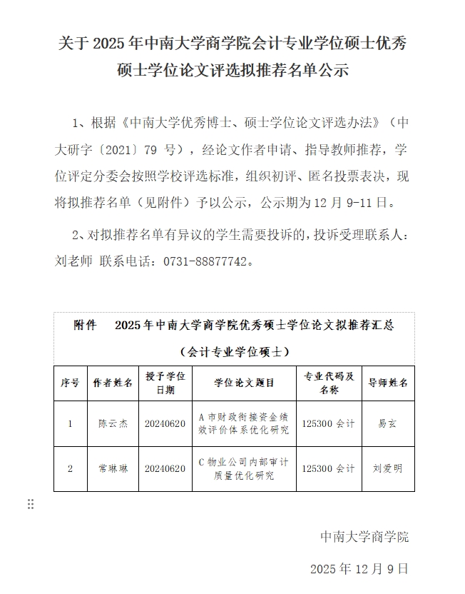 关于2025年德赢vwin体育官网登录会计专业学位硕士优秀硕士学位论文评选拟推荐名单公示