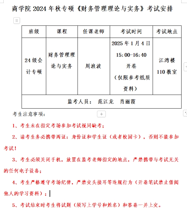 德赢vwin体育官网登录2024年秋专硕《财务管理理论与实务》考试安排