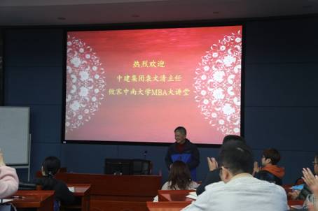 11月10日下午4点,中建集团企业文化部副主任,原中建三局三公司董事长、党委书记袁文清博士应邀来德赢官网进行学术讲座。袁文清主任以“战略的坚守——中国建筑集团发展启示录”为题为大家带来了一场精彩的讲座。讲座由周雄伟教授主持,德赢vwin体育官网登录张颖副院长、MBA中心康静老师以及MBA学生一同聆听了本次讲座。