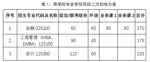 1. 本次复试对象为第一志愿报考我校的专业学位项目(会计专硕、金融专硕、MBA、EMBA),且初试成绩达到德赢vwin体育官网登录二次划定的复试分数线的考生。二次划线方案见表1。