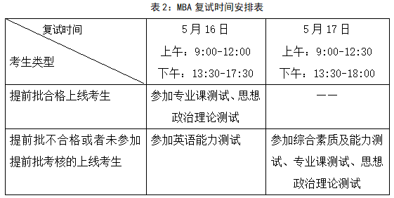 1. MBA考生复试时间:2020年5月16-17日,分多考场同时进行,复试时间安排见表2。