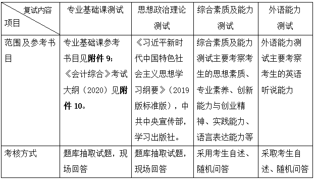 2.会计专硕、EMBA、MBA复试环节满分为200分,复试内容包括:专业基础课测试(满分60分)、综合素质及能力测试(满分60分)、英语能力测试(满分40分)、思想政治理论测试(满分40分)。