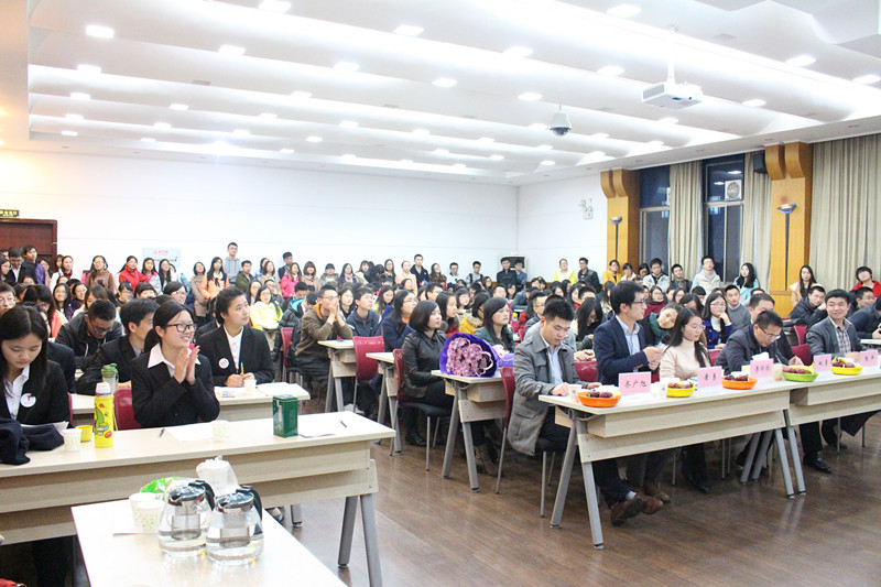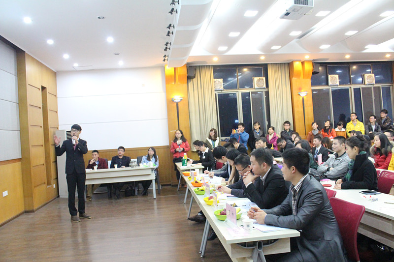 第一个环节是“职场展望”,要求选手按序号进行3分钟的个人展示,洪享同学幽默风趣的介绍、马浩鹏同学别出心裁的视频、郭婧琳同学简洁精致的ppt、还有万维锋同学的英语自我介绍引得观众掌声连连。第二个环节是“职场亮剑”,选手在十个题目中随机抽取一题后对现场抽取的题目给出解答,主要考察选手的临场应变能力。李进同学抽到“如何给一台挖掘机制定营销方案”,他幽默睿智的作答,激发观众笑声不断。