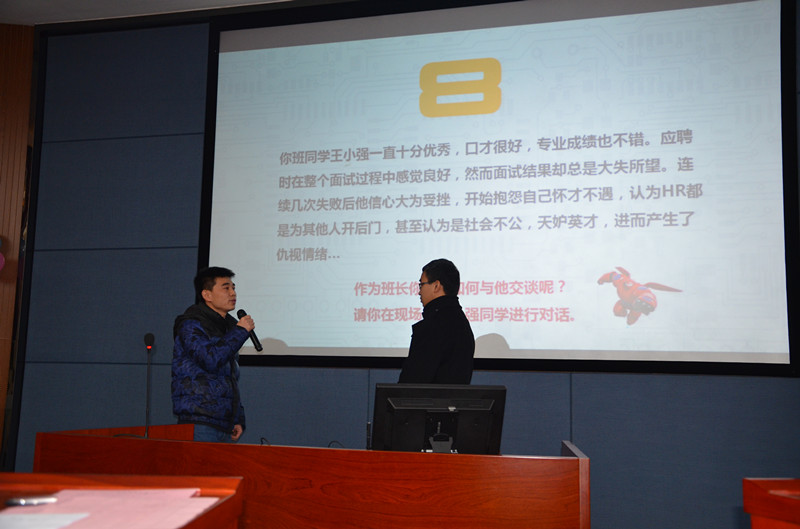 在案例答题区,班长们随机挑选的案例,机智作答。本环节中的案例题针对研究生在读期间学业、情感、就业、人际交往等各方面可能遇到的现实困难,考验班长作为学生干部,应如何与同学沟通并发挥作用。来自法学院的2015级经济法学班长陈佳苗在遇到人际交往有困难的“胡巴”同学时,耐心倾听其内心想法,并一步步对胡同学进行疏导,赢得了现场评委和观众的阵阵掌声;地信院的潘磊同学在面对在找工作过程中经受连连挫折的王小强时,以朋友的角度耐心鼓励他,号召班级同学一起给予小强自信和温暖。