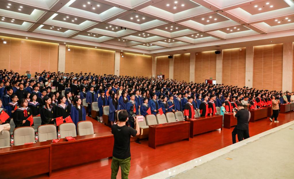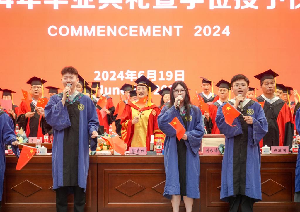 接下来进入合唱环节,全体毕业生齐唱歌曲《光阴的故事》、《歌唱祖国》,歌声嘹亮,传响礼堂。