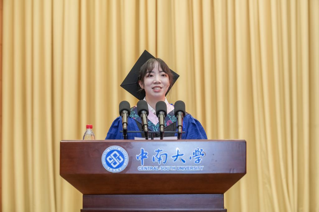 博士生代表王萍回望自己的求学之路,从自我历练到自我发掘,再到自我升华,四年的博士生活是一次对真理的执着追求和对知识无尽热爱的旅程,她呼吁在场同学为梦想不懈奋斗,为社会的发展贡献独特的智慧和力量。